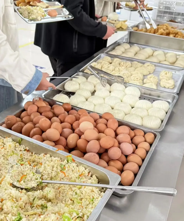 清晨食堂,热腾包子与咸香花卷同屉而蒸;一旁酥脆油条和暄软馒头相叠成堆。师傅翻炒金黄蛋炒饭,配上一颗粉糯的水煮蛋。来张香酥油饼,拿根饱满玉米,再接杯浓醇豆浆,便是完美一餐!